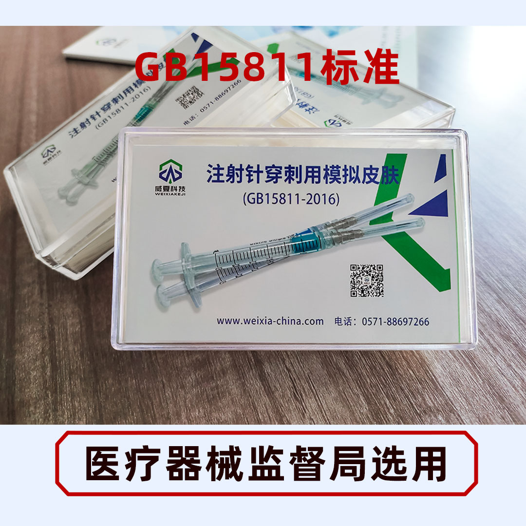 將被檢針和模擬皮膚在22°C+2C下放置至少24h,并在相同溫度下進行測試將適當尺寸的模擬皮膚夾在夾具上,不得有任何明顯的拉伸或壓縮力施加在模擬皮膚上將被檢針裝在設備上,其軸線垂直于模擬皮膚的表面,針尖指向圓形穿刺區域的中心;將移動速度設定為100mm/min;開動測試裝置;在膜上穿刺過程中,同時測得鋒利值或記錄力/位移圖